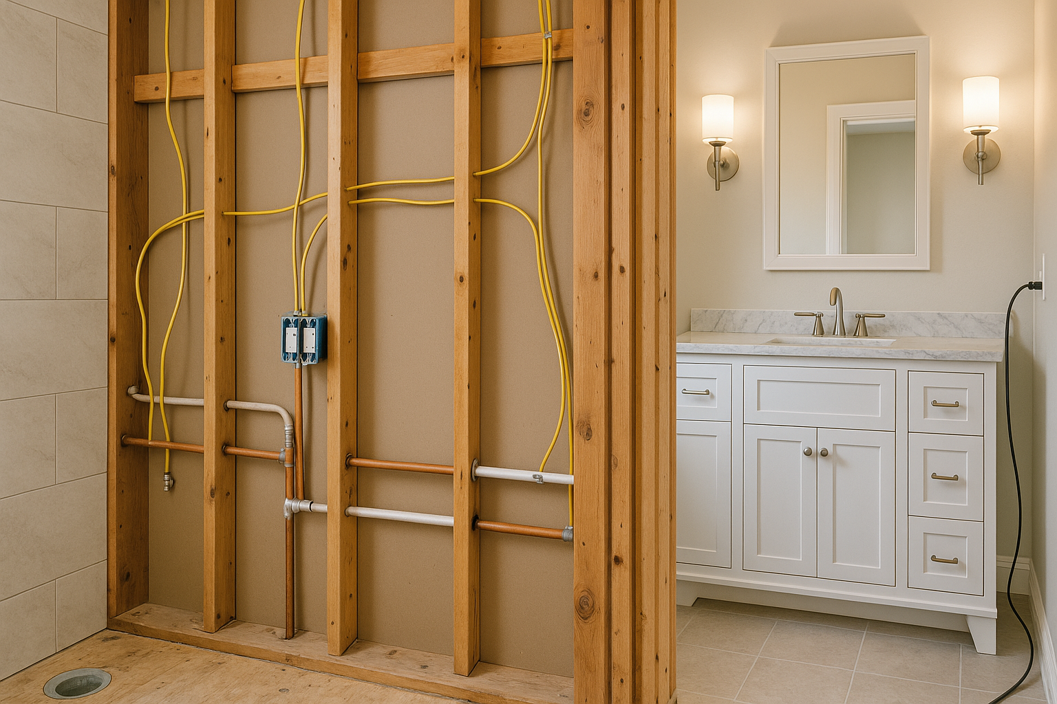 Once tile and cabinetry are in place, we install lighting, switches, outlets, and fans with clean, precise finishes.